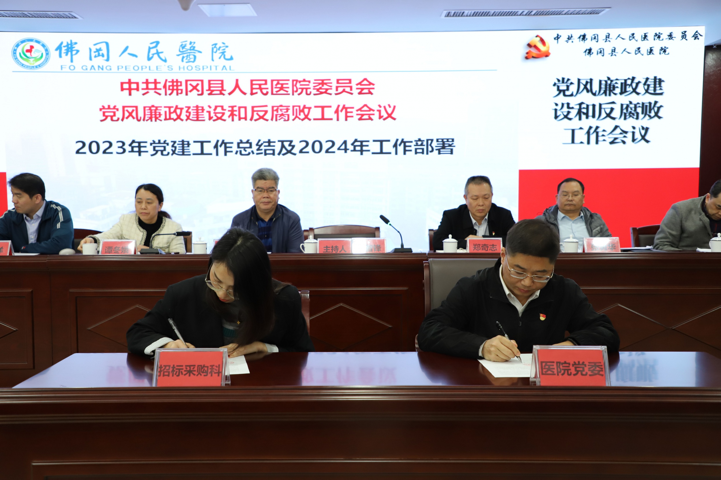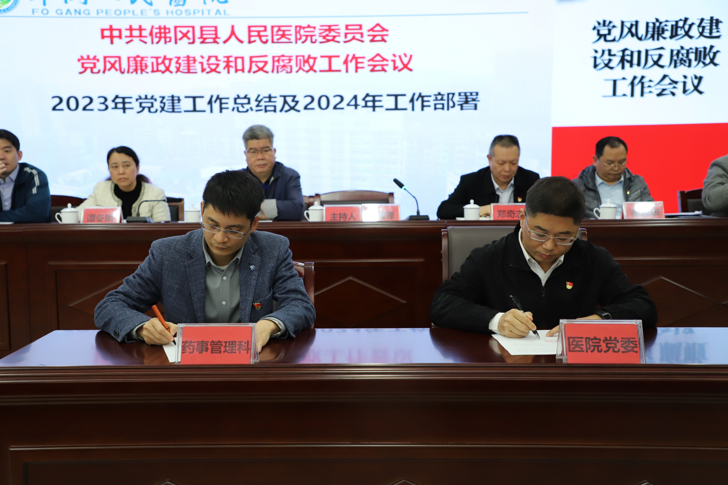 李智锋书记对2023年医院党建工作进行了总结和分析,并对2024年党建重点工作进行了部署。李智锋书记强调,医院党建工作要始终围绕“人民健康”为中心,要在“政治建设、思想建设、作风建设、纪律建设”上下功夫,筑牢“病人至上,员工为本,真诚关爱”的核心价值观理念,进一步加强党建和党风廉政建设,严格落实日常检查督导力度,强化党建考核目标,以高质量党建引领业务高质量发展,积极打造“服务型医院”,扩宽服务的深度和广度,努力提升服务效率。随后,李智锋书记分别与行政后勤、门诊医技科室代表现场签署了《党风廉政建设责任书》,招标采购科、药事管理科负责人就党风廉政建设作表态发言。