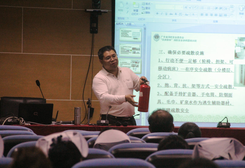 演练前,医院消防专职负责人钟绍均为参与演练的干部职工们开展消防知识培训,从火灾的常见原因、消防日常管理、消防火灾的应急和预防、消防器材的正确使用方法、疏散逃生的基本常识等方面进行了深入浅出的讲解。