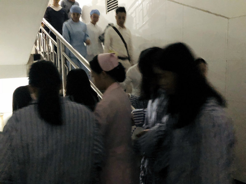 随后开展消防演练。演练开始后,医院突发火情,警铃声大响,一名急诊病人经过紧急救治后,住院部8楼全体人员迅速向室外进行疏散。职工们在预设的烟雾装置中安全、有序的穿过滚滚浓烟,从逃生楼梯迅速撤离到办公楼外的安全区域,其中没有出现拥挤摔倒现象。