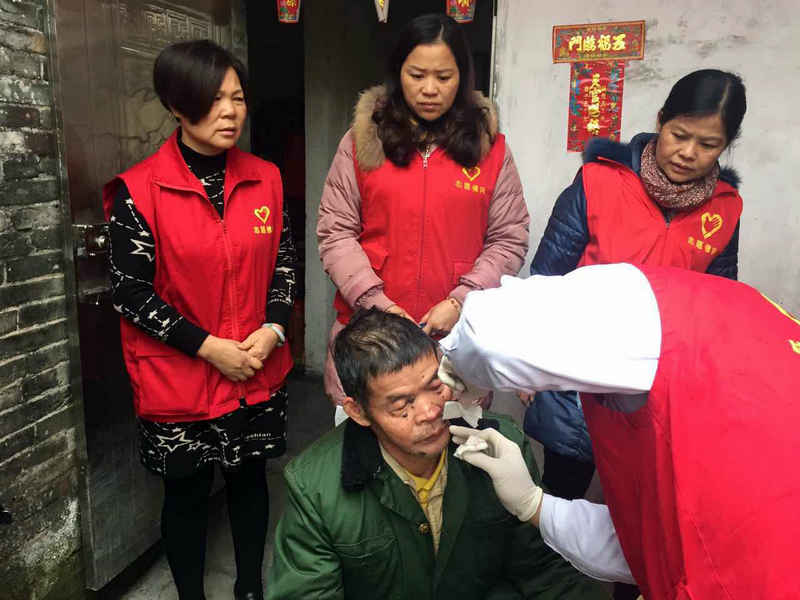 在朱老伯家中,志愿者们发现朱老伯及其妻子有严重的创口病症,尤其是朱老伯,由于妻子及其儿子的智力均有不同程度的缺陷,家境十分贫困,创口得不到处理,导致朱老伯的面部创口严重化脓溃烂。医疗队现场对两夫妻的创口先进行简单的清洗包扎,并迅速联系村委安排好人照顾小孩子及车辆,将两夫妇送往佛冈县人民医院治疗,通过绿色通道安排住院手续,专家会诊确定清创缝合手术方案。接下来,小雨点志愿服务队将积极向县民政局申请相关补助,连及村委、爱心人士捐款等为朱老伯筹措医疗救治费用。