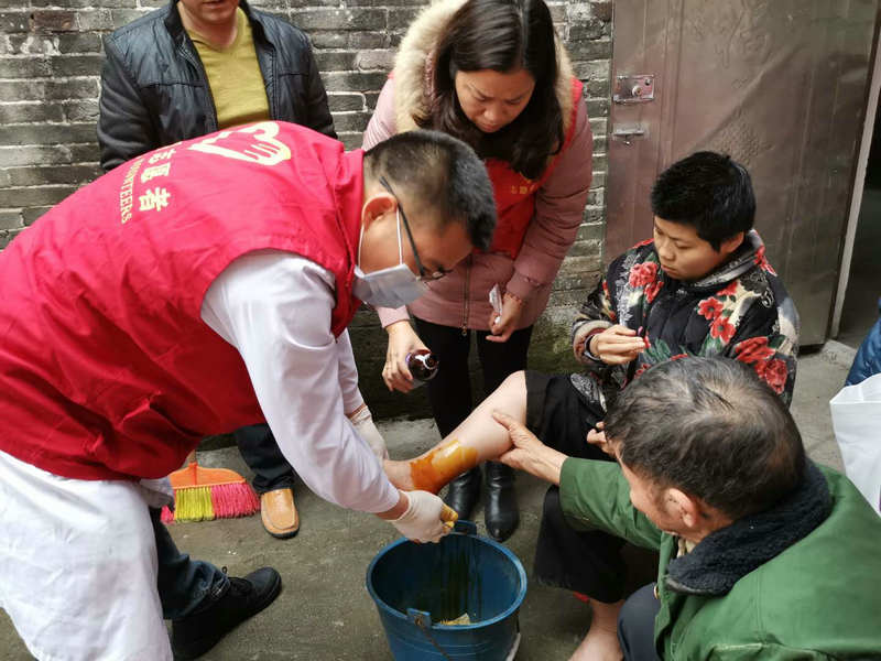 在林奶奶家里,医疗队对林奶奶进行问诊,并对她身体进行细致检查,当听闻林奶奶表示脚时常抽筋时,医疗队对林奶奶进行了按摩,并按照其身体情况赠送医用药品。林奶奶非常开心激动,向志愿者连连表示感谢。