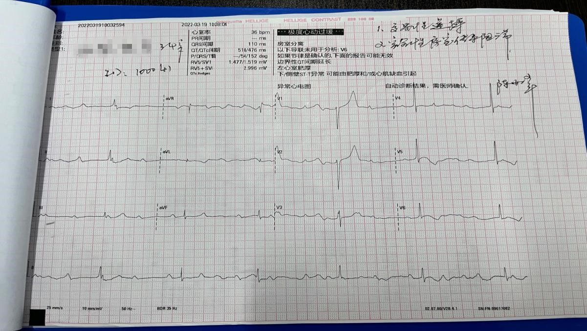心电图显示:交界性逸搏心律、完全性房室传导阻滞,极度心动过缓