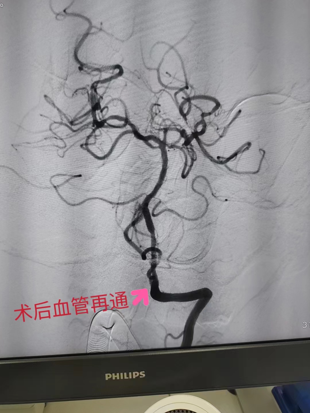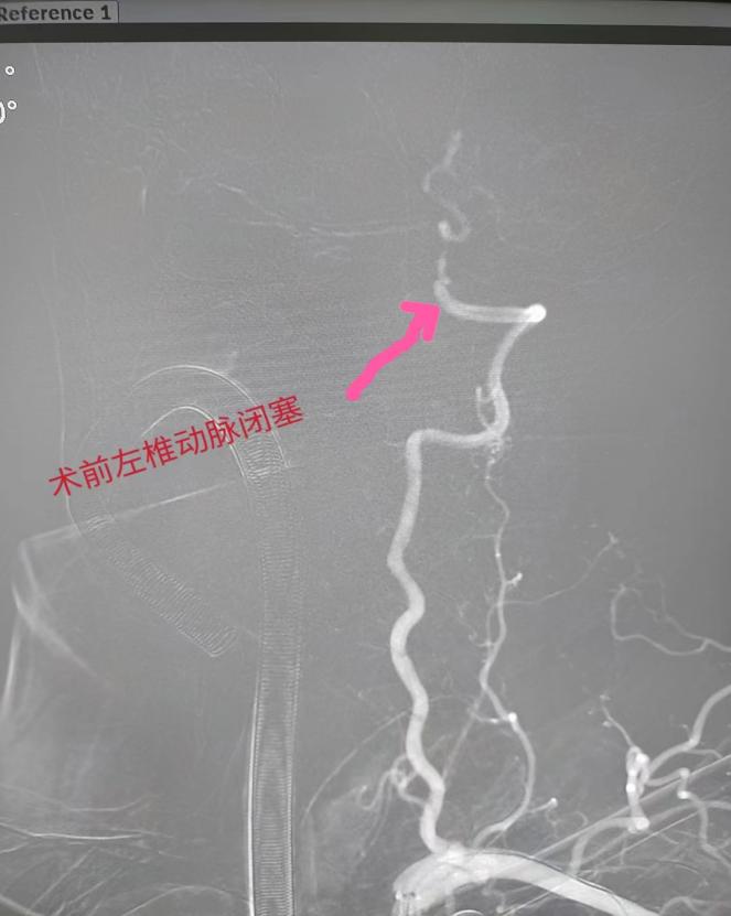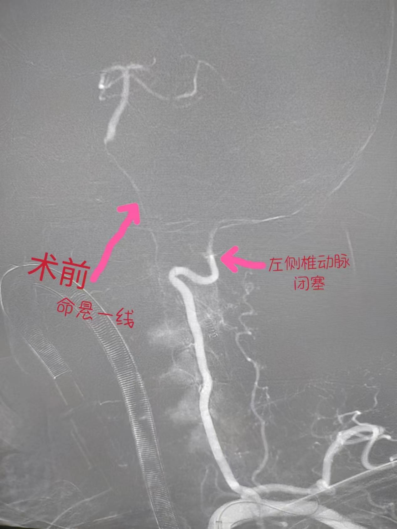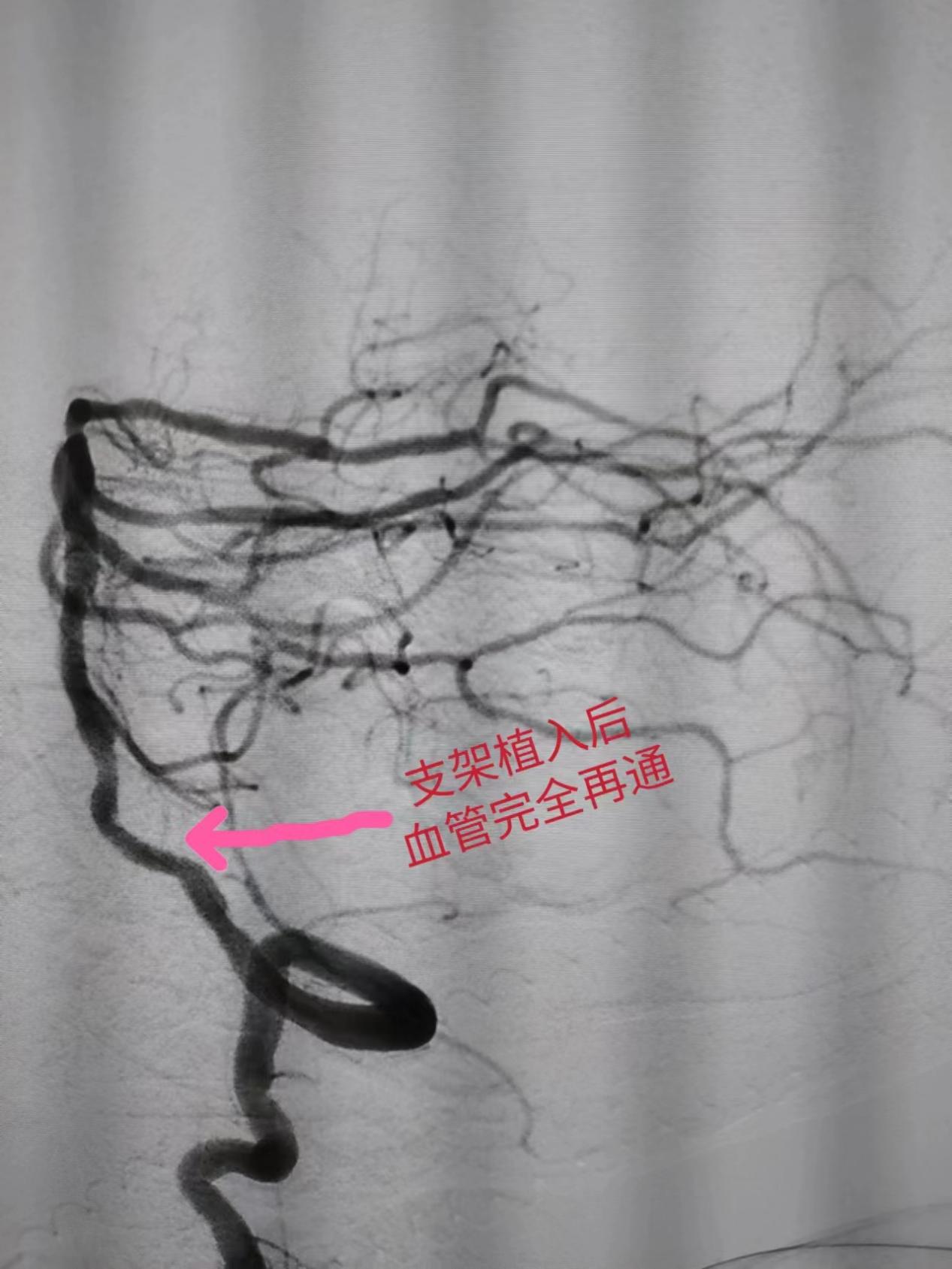 在导管室行全脑血管造影检查,明确为椎动脉闭塞后靠脊髓前动脉部分代偿基底动脉。神经内科团队立即给患者行椎基底动脉介入取栓和支架植入手术,成功开通血管,饶大叔安返病房,目前其说话清晰,肌力基本恢复正常,日常生活能自理。