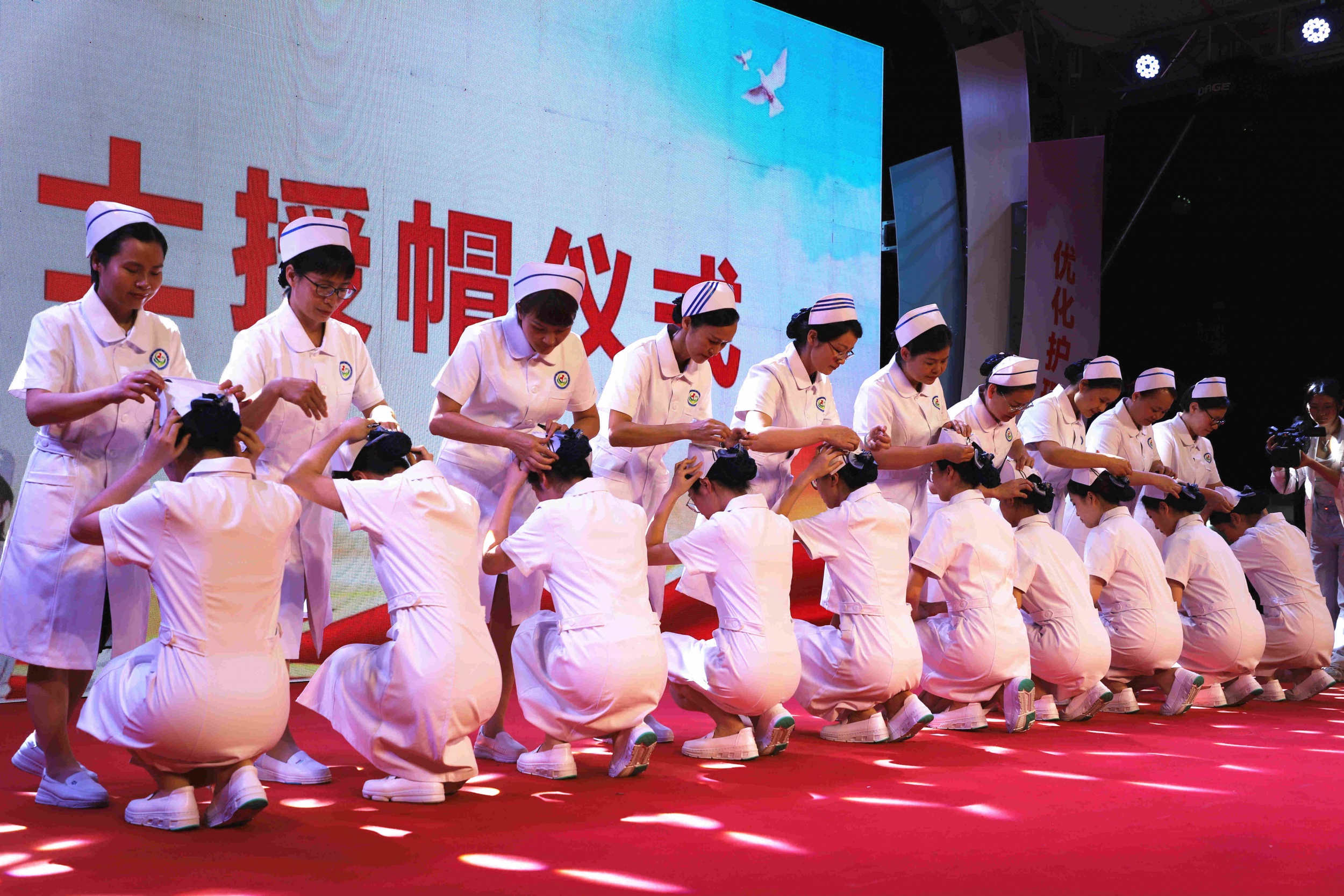现场还进行了授帽仪式,护理前辈为新护士戴上圣洁的燕尾帽,她们将沿着前辈的足迹,向着南丁格尔的灯光,肩负起救死扶伤的责任,继承和发扬护理事业的光荣传统。